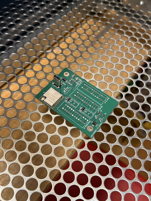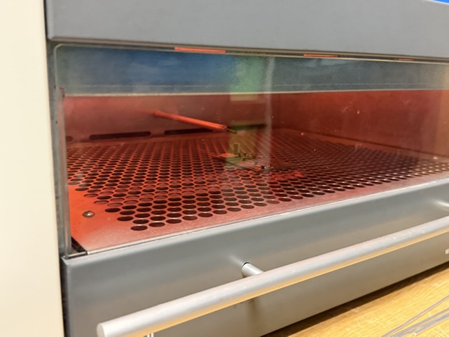 Nach vorbereiten der Platine, mit der speziellen Lötpaste und platzieren der Bauelemente auf der Platin, wurde diese bestückte Platine nun in den Reflow Ofen gelegt.